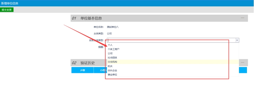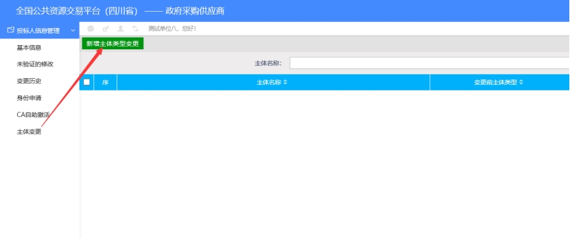 1、點(diǎn)擊主體變更頁面的“新增主體類型變更”: