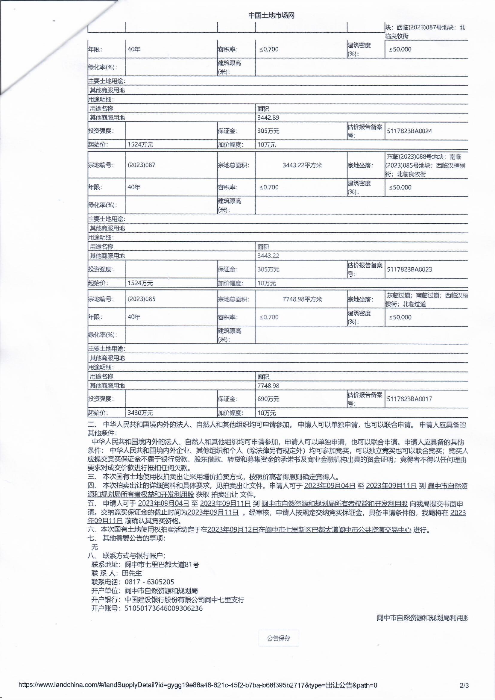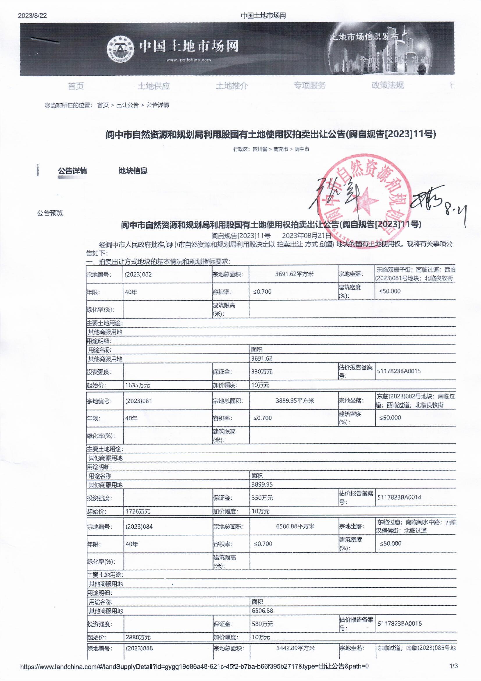 閬中市自然資源和規(guī)劃局利用股國有土地使用權拍賣出讓公告(閬自規(guī)告[2023]11號)